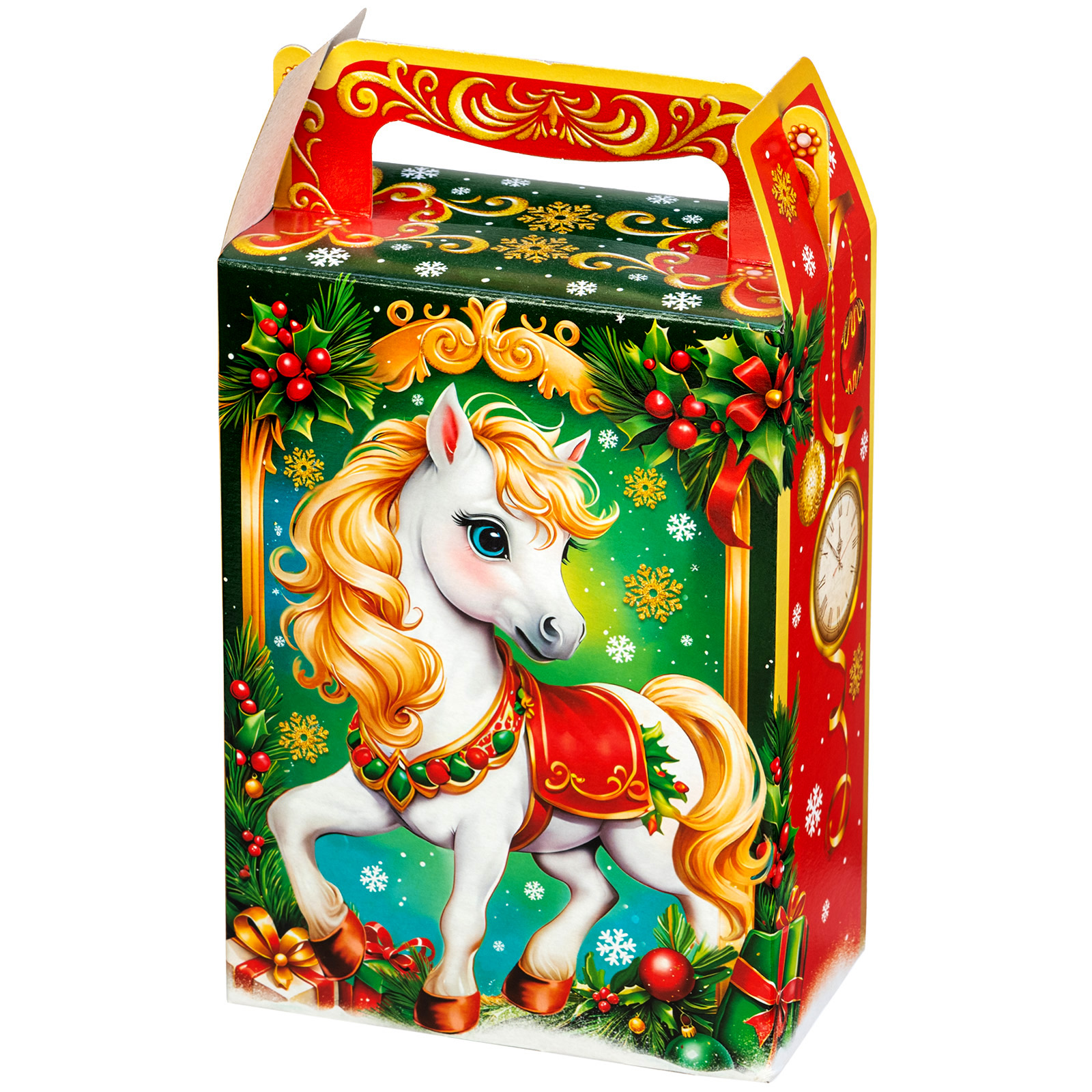 Сладкий подарок в привлекательной яркой упаковке - это то,что нужно, чтобы задать хорошее настроение празднику. “Бусинка” - небольшой подарок в картонной коробочке, который можно смело вручить сластене любого возраста.Упаковка выполнена в виде небольшого прямоугольного ящика с удобной красной ручкой, украшенной золотистыми узорами. Спереди изображена главная героиня - маленькая белоснежная лошадка с золотистой гривой и таким же хвостиком. Внутри этой коробки аккуратно лежат самые разнообразные сладкие угощения на любой вкус и небольшой памятный сувенир, который поможет надолго сохранить воспоминания об этом прекрасном светлом празднике.