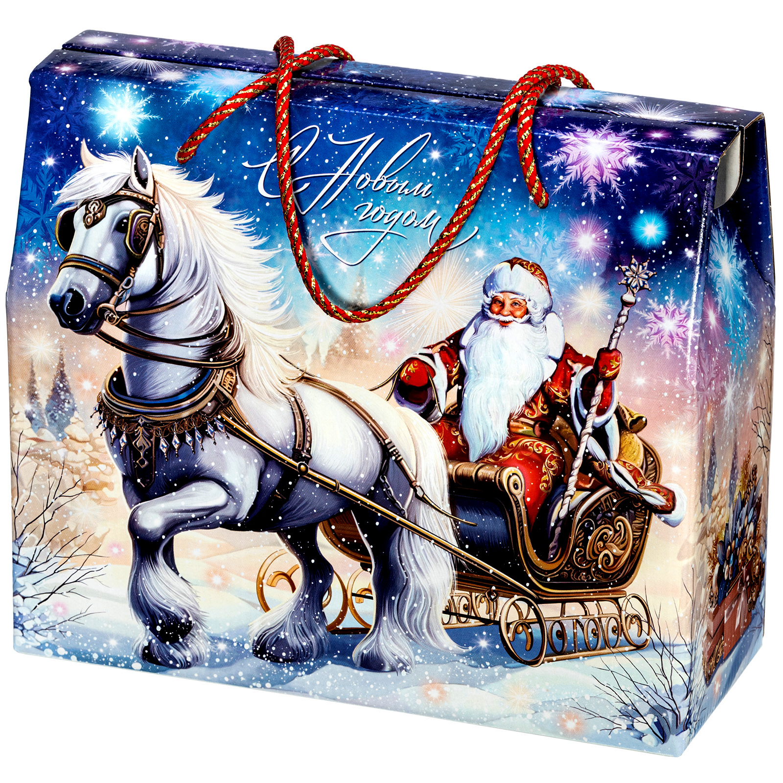 Новогодний сладкий подарок должен обладать не только замечательным вкусом сладостей, но и иметь яркую оригинальную упаковку, которую так и не терпится раскрыть! “Сумочка визит” - компактная картонная коробочка с удобной ручкой-шнурком красного цвета. Наличие ручки делает набор крайне удобным для транспортировки, что позволяет взять такой подарок в дорогу, чтобы вручить другу или родственнику из другого города. На сумочке изображен Дедушка Мороз в упряжке, а внутри этого подарка бережно хранятся отборные сладости, которые идеально подойдут к любому праздничному столу.